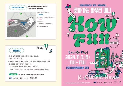 K-Classic News 기자 | 남원시는 11월 9일 토요일 11시부터 17시까지 남원시립김병종미술관 일대에서 국립아시아문화전당재단과 함께 ‘어린이·가족 문화축제 How Fun(하우펀)’행사를 개최한다고 알려왔다.
