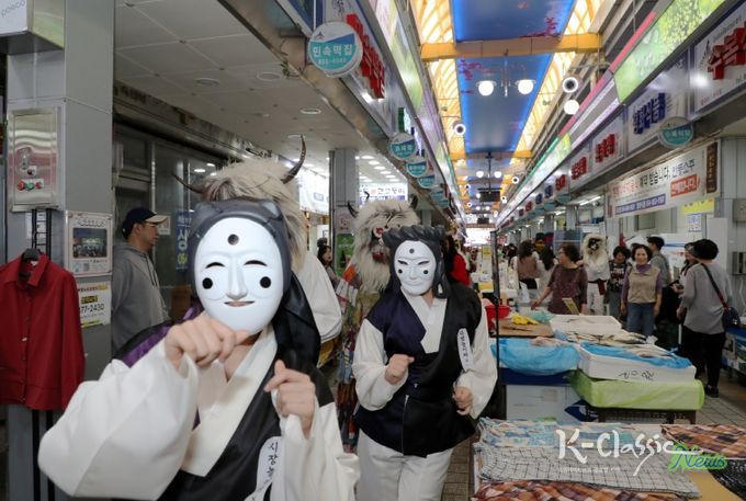 K-Classic News 기자 | 9월 29일 오후, 안동 구시장 일대가 흥겨운 퍼레이드로 활기를 띠었다. 안동국제탈춤페스티벌 기간 동안 안동의 구시장, 신시장, 용상시장이 매일 흥겨운 퍼레이드 무대로 변신한다. 축제 개막일을 제외한 9일간 매일 이어지는 시장 퍼레이드는 상인과 시민, 관광객이 함께 어울리며 시장 골목을 축제의 한복판으로 만든다.