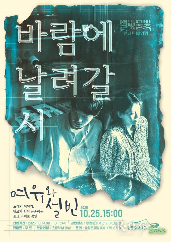 K-Classic News 기자 | 양평문화재단은 오는 10월 25일 오후 3시, 양평문화재단 2층 씨어터양평에서 ‘별빛물빛 콘서트 in 양평’ 10월 정기 공연으로 인디 듀오 여유와 설빈의 '바람에 날려갈 시'를 선보인다.