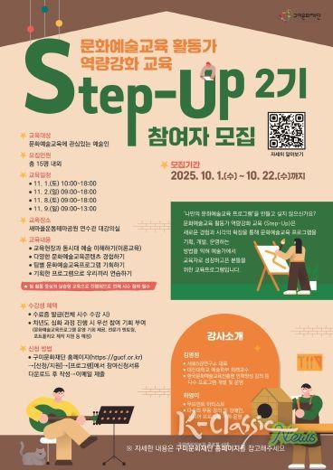 K-Classic News 기자 | (재)구미문화재단은 문화예술교육 활동가 역량강화 교육 프로그램 'Step-Up' 2기 참여자를 오는 10월 1일부터 22일까지 모집한다고 밝혔다.