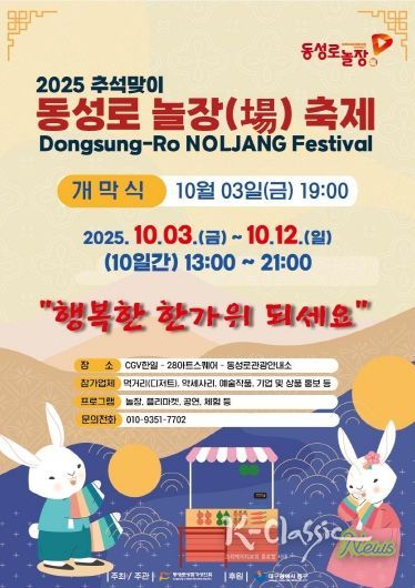 K-Classic News 기자 | 대구 중구는 10월 3일부터 12일까지 10일간 동성로 보행자전용도로 일원에서 ‘동성로에서 놀며 장보자!’라는 테마로 ‘2025 추석맞이 동성로 놀장(場) 축제’를 개최한다.