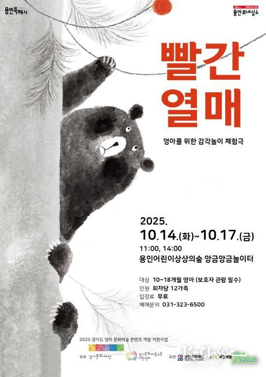 K-Classic News 기자 | 용인문화재단은 오는 10월 14일부터 10월 17일까지 2025 ‘경기문화재단 문화예술교육 지원사업’의 일환으로 개발된 영아 문화예술 콘텐츠 ‘오감자극 베이비 연극 '빨간 열매'’를 용인어린이상상의숲 영유아 전용 공간 ‘앙금앙금놀이터’에서 선보인다.
