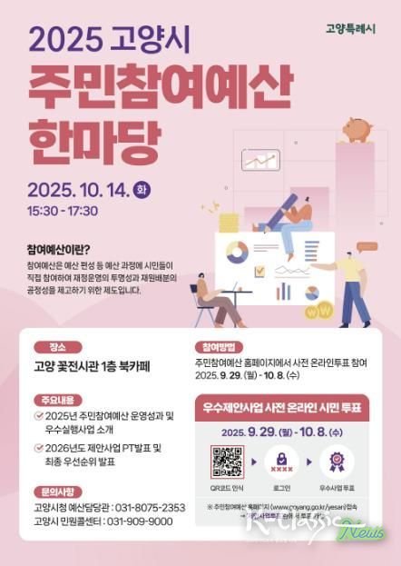 K-Classic News 기자 | 고양특례시는 오는 10월 14일 오후 3시 30분, 일산호수공원 고양꽃전시관(북카페)에서 ‘2025년 고양특례시 주민참여예산 한마당’을 개최한다고 밝혔다.