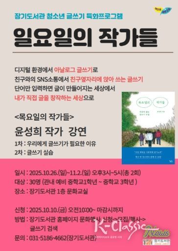 K-Classic News 기자 | 김포시 장기도서관은 청소년 글쓰기 특화프로그램으로 '일요일의 작가들'을 오는 10월 26일, 11월 2일 오후 3시부터 5시까지 장기도서관 1층 문화교실에서 운영한다고 밝혔다