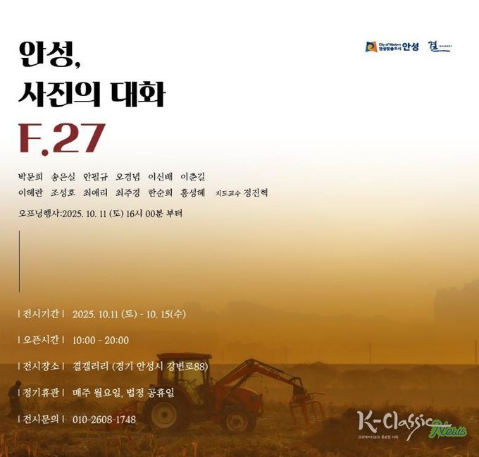 K-Classic News 기자 | 안성시 사진동아리 F.27 photo가 오는 10월 11일부터 15일까지 안성천 작은미술관 결갤러리에서 전시회 ‘안성, 사진의 대화 F.27’을 개최한다. 이번 전시는 동아리 회원 18명이 참여해 안성의 자연환경과 사람들의 이야기를 기록한 작품을 선보인다.