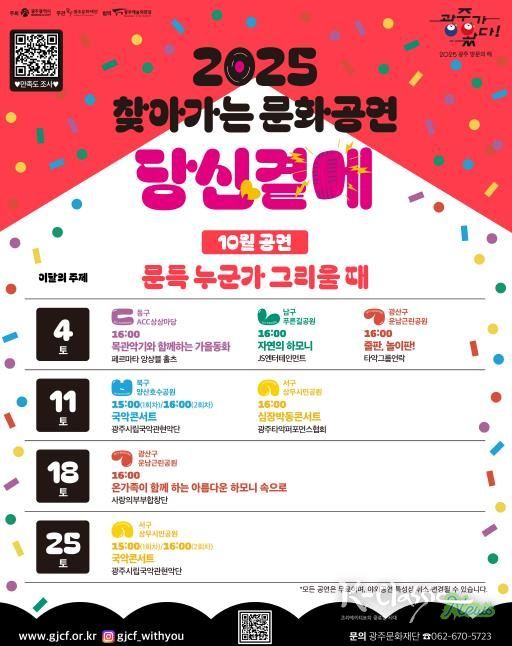 한편, ‘2025 찾아가는 문화공연 '당신곁에'’는 광주시의 시민 체감형 문화정책 실현의 하나로, 광주예술의전당과 협력하여 추진된다.