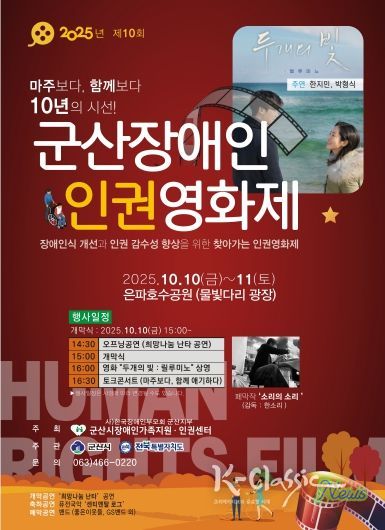 K-Classic News 기자 | 군산시 장애인가족지원인권센터가 10월 10일부터 11일까지 은파호수공원 물빛다리 광장에서 군산시민을 대상으로 장애인 인식개선 및 인권의식 함양을 위한 2025년 제10회 군산장애인인권영화제를 개최한다.