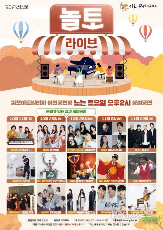 K-Classic News 기자 | (재)김포문화재단은 10월 11일부터 11월 22일까지 매월 둘째, 넷째 주 토요일마다 김포아트빌리지 야외공연장에서 하반기 토요상설공연 '놀토 라이브'를 개최한다고 밝혔다.