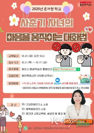 K-Classic News 기자 | 용인특례시는 ‘사춘기 자녀 마음을 움직이는 대화법’을 주제로 한 ‘2025년 온가정 학교’ 온라인 특강 참가자를 모집한다고 2일 밝혔다.