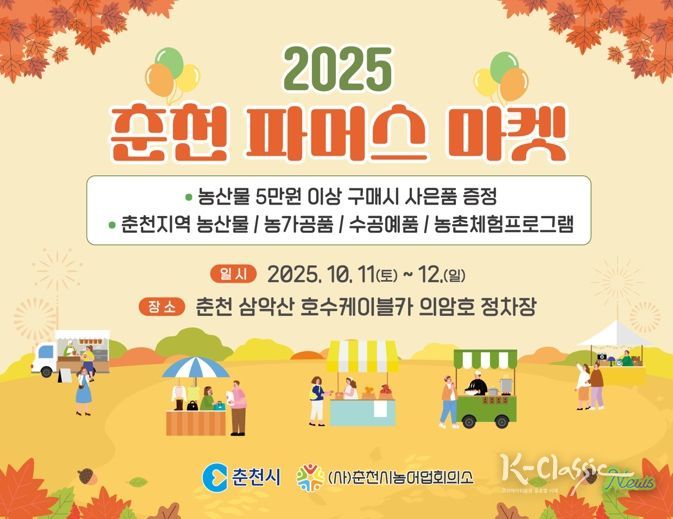 K-Classic News 기자 | 춘천시가 오는 11일부터 12일까지 이틀간 삼악산 호수케이블카 의암호 정차장 마당에서 ‘2025 제2회 춘천 파머스마켓’을 연다. 지난 6월에 열린 파머스마켓 1회에 이어 마련된 이번 장터는 춘천시가 주최하고 춘천시귀농귀촌지원센터가 주관한다.