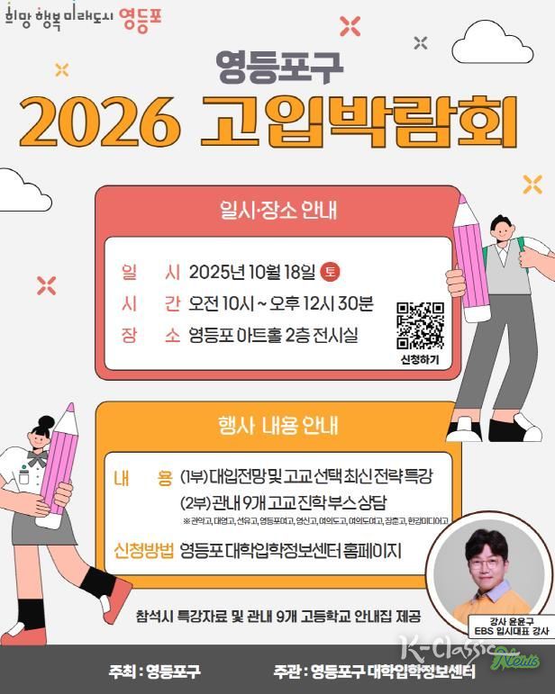 K-Classic News 기자 | 영등포구가 10월 18일 오전 10시, 영등포 아트홀 전시실에서 중학생과 학부모를 위한 ‘2026학년도 고입박람회’를 연다고 밝혔다. 내달 시작되는 고입 원서접수를 앞두고 최선의 진학 선택을 돕기 위해 마련된 자리다.