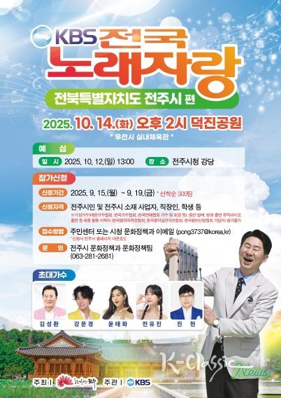 전주시는 오는 14일 오후 2시, 덕진공원 특설무대에서 시민과 함께하는 전국민적 노래 경연 프로그램인 ‘KBS 전국노래자랑 전주시편’이 진행된다고 10일 밝혔다.