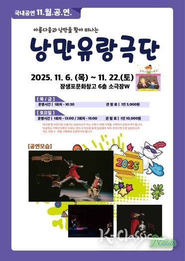 K-Classic News 기자 | 고래문화재단(이사장 서동욱)은 11월 6일부터 22일까지 어린이를 위한 상설공연으로 ‘낭만 유랑극단’을 총 12회에 걸쳐 무대에 오른다고 밝혔다.
