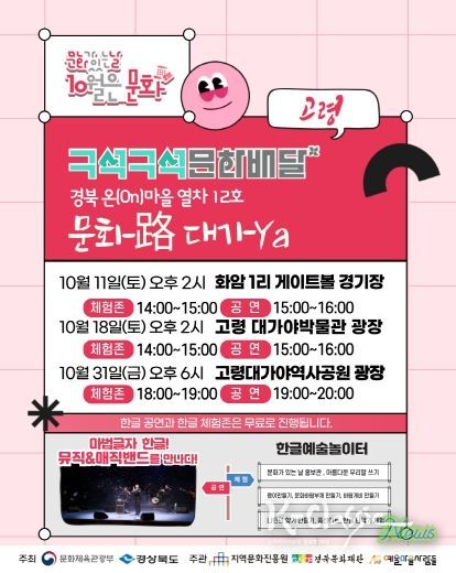 K-Classic News 기자 | 2025 문화가 있는 날 '구석구석 문화배달' 경북 온(On)마을 열차 12호 고령군 ‘문화路 대가ya’가 10월 문화의 달을 맞아 총 3회의 공연을 선보인다. 이번 행사는 문화체육관광부와 경상북도가 주최하고, 지역문화진흥원·경북문화재단·예술마을사람들이 주관하며, 고령군과 협력해 진행된다.