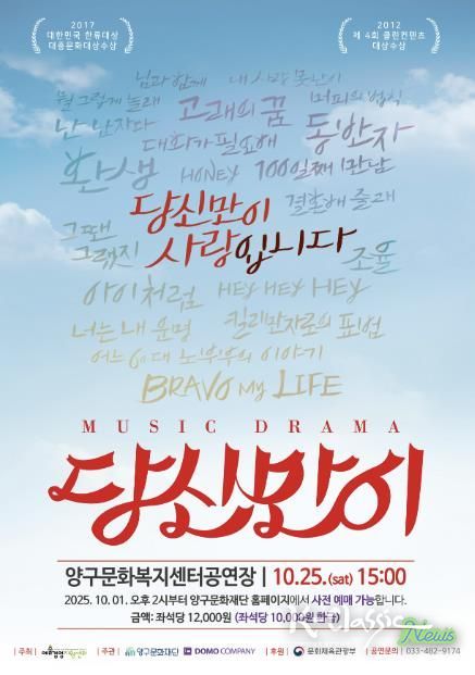 K-Classic News 기자 | 양구문화재단은 깊어가는 가을, 가족 모두가 함께 즐길 수 있는 뮤지컬 ‘당신만이’를 오는 25일 오후 3시, 양구문화복지센터 공연장에서 선보인다.