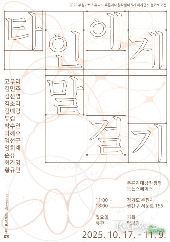 K-Classic News 기자 | 수원문화재단은 오는 10월 17일부터 11월 9일까지 약 3주간 탑동 시민농장에 자리한 수원아트스튜디오 푸른지대창작샘터에서 5기 레지던시 참여작가 13인의 올 한 해 작품 활동 성과를 공유하는 결과보고전 '타인에게 말 걸기'를 개최한다.