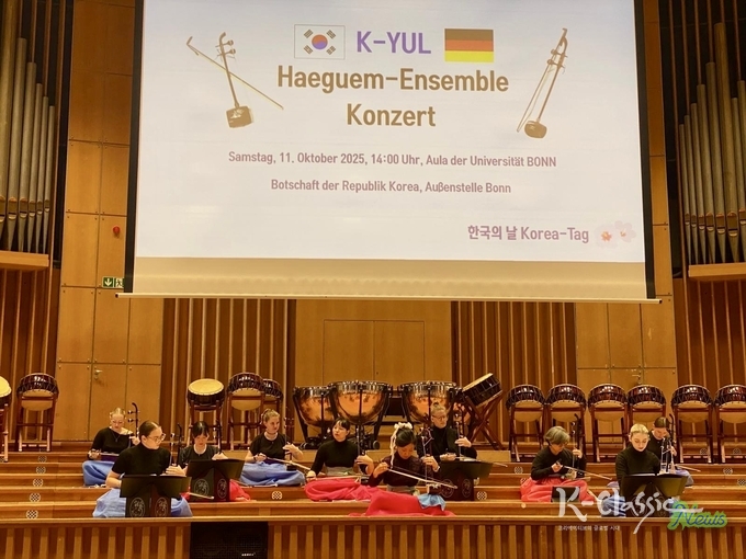 이어서 무대에 오른 해금 앙상블 K-YUL(케이율, 단장:노유경)은 쾰른대학교와 아헨공대 학생들로 시작해, 지금은 재외동포와 교포세대까지 함께 하는 열린 앙상블로 성장한 단체다. ‘K’는 Korea, Köln, Kultur를, ‘Yul(律)’은 조화와 울림, 그리고 음악의 생명을 뜻한다. 서로 다른 배경의 연주자들이 하나의 숨으로 엮이는 그 순간마다 해금의 두 줄 현이 떨렸고, 그 미세한 진동이 관객들의 마음을 건드렸다. 어떤 이는 눈을 감았고, 어떤 이는 손끝으로 박자를 따라 두드렸다.그 소리 속에는 한국의 정서와 독일의 감각이 함께 살아 있었다. 마지막 곡으로 연주된 〈고향의 봄〉에서는 관객들이 노래를 따라 부르며, 음악은 언어를 대신했고 정이 공간을 채웠다.