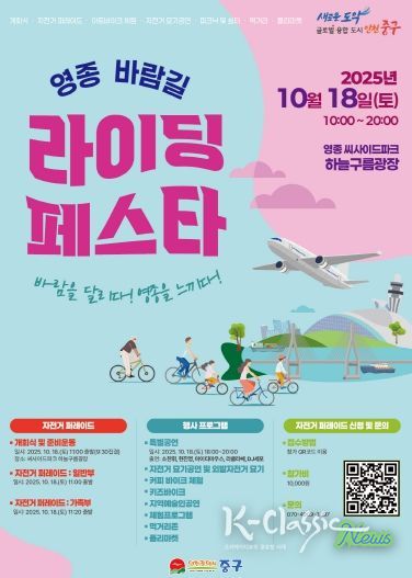 K-Classic News 기자 | 축제의 계절 가을이 성큼 다가왔다. 이맘때쯤이면 어디서 무엇을 즐겨야 할지가 가장 큰 고민일 것이다. 올 주말, ‘영종 바람길 라이딩 페스타’에서 친구, 가족, 연인 등 사랑하는 사람들과 특별한 나들이를 떠나보는 것은 어떨까?