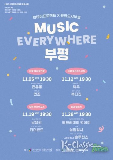 K-Classic News 기자 | 부평구 문화재단 문화도시센터는 오는 11월 매주 수요일 오후 7시 30분 지역 뮤지션들의 공연 ‘MUSIC EVERYWHERE 부평’을 총 4회에 걸쳐 진행한다고 밝혔다.