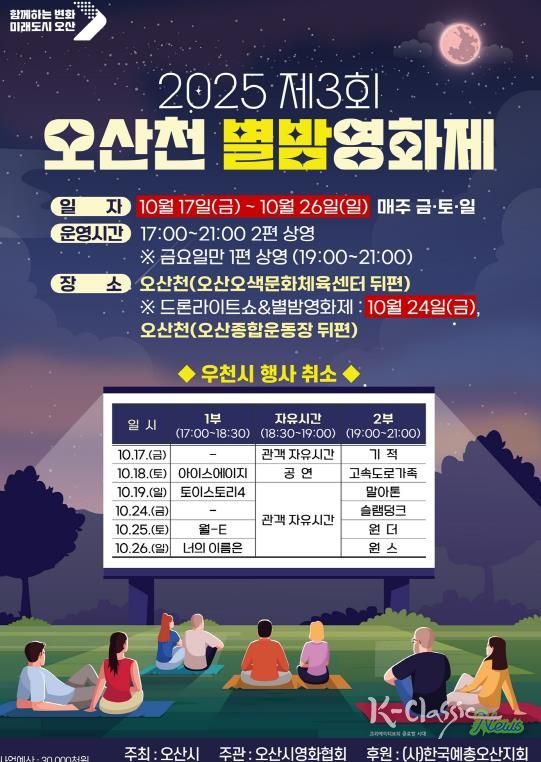K-Classic News 기자 | 오산시는 오는 10월 17일부터 26일까지 매주 금·토·일 저녁, 오산천(오색문화체육센터 뒤편)에서 시민들이 야외에서 영화를 즐길 수 있는 '2025 제3회 오산천 별밤영화제'를 개최한다고 밝혔다.