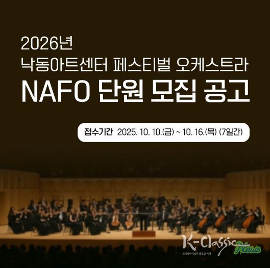 K-Classic News 기자 | 부산 강서구는 서부산 최초의 클래식 전문 공연장인 낙동아트센터와 함께할 ‘낙동아트센터 페스티벌 오케스트라(NAFO)’ 단원을 공개 모집한다고 밝혔다.