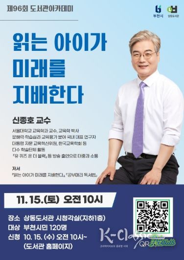 K-Classic News 기자 | 부천시는 11월 15일 오전 10시 부천시립상동도서관 시청각실에서 인공지능(AI)·디지털 시대 학습 경쟁력의 핵심인 문해력을 주제로 ‘제96회 도서관 아카데미’를 연다. 이번 강연은 ‘읽는 아이가 미래를 지배한다’의 저자이자 서울대학교 교육학과 교수인 신종호 교수를 초청해 진행한다.
