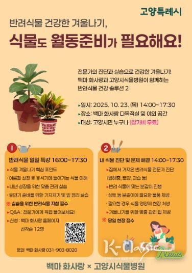 K-Classic News 기자 | 고양특례시는 반려식물의 건강한 겨울나기를 위한 맞춤 해법을 제공하는 ‘그린케어, 겨울 대비 반려식물 돌보기 행사’를 오는 10월 23일 오후 2시부터 5시 30분까지 백마 화사랑에서 개최한다고 밝혔다.