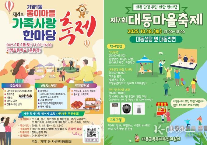 K-Classic News 기자 | 대전 동구는 오는 18일 구 대표 마을 축제인 ‘제4회 가양1동 봉이마을 가족사랑 한마당 축제’와 ‘제7회 대동 마을축제’를 잇따라 개최한다고 15일 밝혔다.