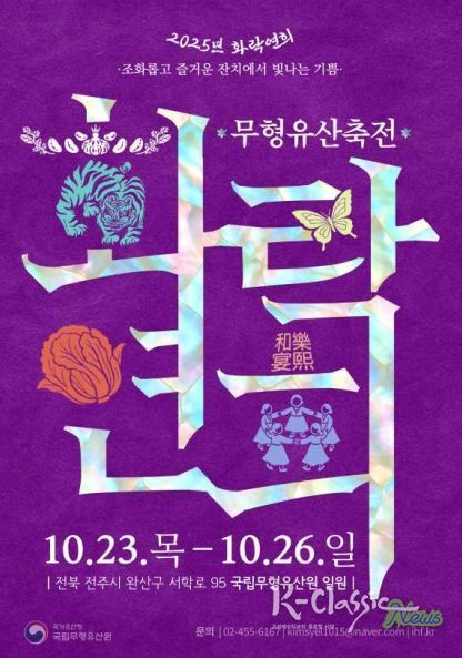 K-Classic News 기자 | 국가유산청 국립무형유산원(원장 박판용)은 10월 23일 오후 5시 개막식을 시작으로 26일까지 국립무형유산원(전북 전주시)에서 다양한 무형유산을 한 자리에서 경험할 수 있는 무형유산 종합축제 「2025년 무형유산축전, ‘화락연희’」를 개최한다.
