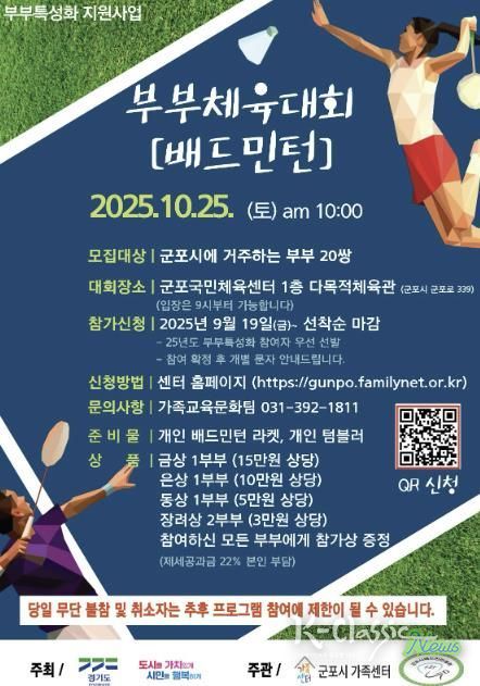 K-Classic News 기자 | 군포시가족센터는 오는 10월 25일 10시부터 군포국민체육센터 1층 다목적체육관에서 부부특성화지원사업의 일환으로 부부체육대회 배드민턴을 개최한다.