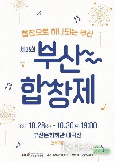 부산시립합창단(예술감독 이기선)이 마련한 『제36회 부산합창제』가 10월 28일부터 30일까지 3일간 오후 7시 부산문화회관 대극장에서 개최된다. 1985년 시작된 부산합창제는 부산 지역에서 가장 오랜 전통을 자랑하는 합창 축제로, 올해로 제36회를 맞이한다.