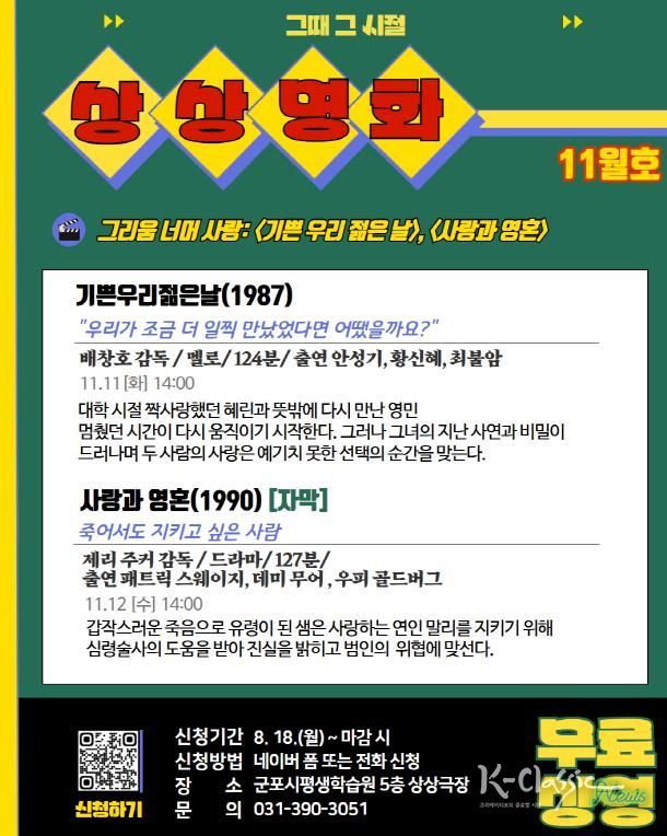 K-Classic News 기자 | 군포문화재단 군포시평생학습원 상상극장은 오는 11월 11일과 12일 고전영화 상영 프로그램 ‘상상명화’를 운영한다. ‘그리움 너머 사랑’을 주제로 〈기쁜 우리 젊은 날〉과 〈사랑과 영혼〉을 상영한다.