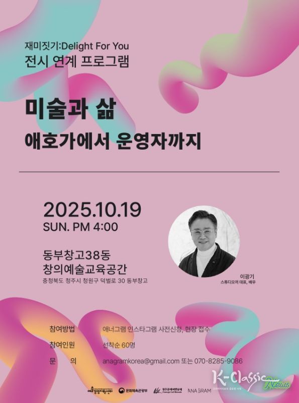 이번 강연은 2025 청주공예비엔날레에서 만나는 신진작가 전시 ‘재미 짓기 : Delight for you(이하, 재미 짓기)’와 연계한 프로그램으로, 미술 애호가에서 아트 스튜디오의 운영자로 예술을 통해 삶의 재미를 풍성하게 지어온 배우 이광기 씨의 세상을 엿보는 기회다.