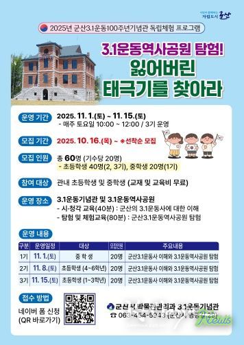 대상은 군산시 관내 초등학생(40명)과 중학생(20명)이라면 무료로 참여할 수 있으며, 참가 신청은 16일부터 네이버 폼 QR코드 접속을 통해 가능하다.