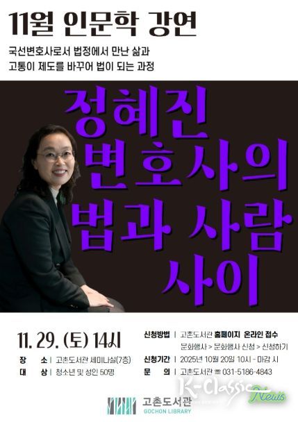 K-Classic News 기자 | 김포시 고촌도서관은 오는 11월 29일 오후 2시부터 4시까지 '법과 사람 사이' 강연을 운영한다.