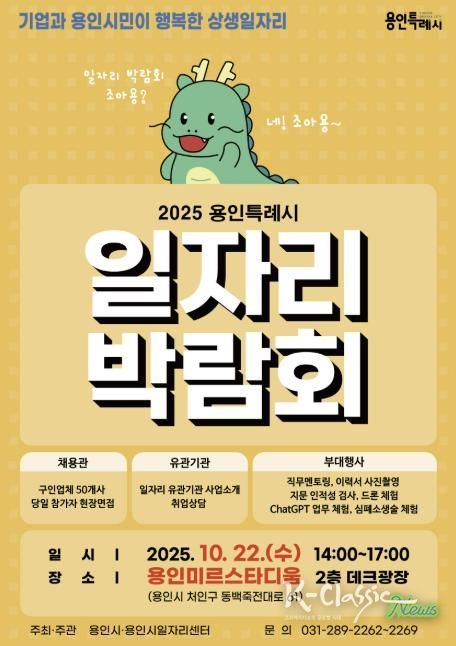 K-Classic News 기자 | 용인특례시는 오는 22일 오후 2시부터 5시까지 용인미르스타디움 2층 덱(deck) 광장에서 2025년 하반기 일자리박람회를 개최한다고 17일 밝혔다.