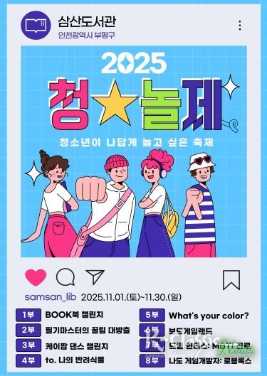K-Classic News 기자 | 부평구 구립 삼산도서관은 11월 한 달간 청소년(중학교 1학년~고등학교 3학년) 대상 문화체험 프로그램 ‘청★놀제: 청소년이 나답게 놀고 싶은 축제’를 운영한다.