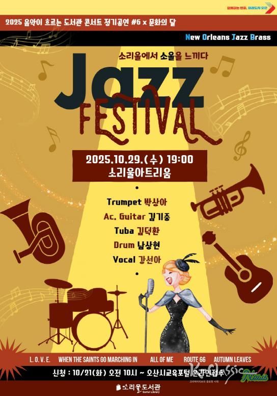 K-Classic News 기자 | 경기도 오산시는 오는 10월 29일 오후 7시, 소리울도서관 3층 소리울아트리움에서 '2025 음악이 흐르는 도서관 콘서트 정기공연 #6 × 문화의 달 – Jazz Festival; 소리울에서 소울을 느끼다'를 개최한다고 밝혔다.