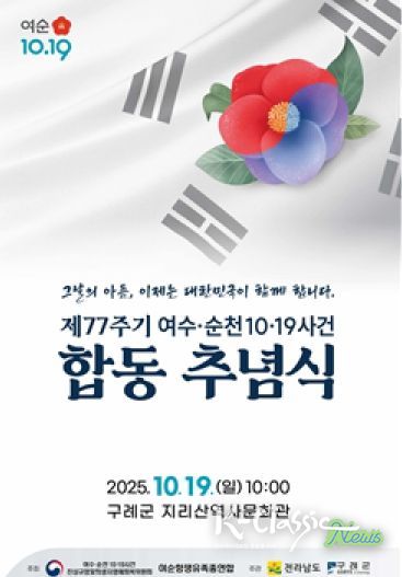 K-Classic News 기자 | 전남 구례군은 여순사건의 역사적 의미를 되새기고 희생자와 유족들을 위로하기 위한‘여순사건 제77주기 정부주최 합동추념식’이 오는 19일 구례군 지리산역사문화관에서 개최된다고 밝혔다.