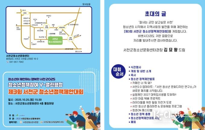 K-Classic News 기자 | 서천군청소년문화센터는 청소년들이 건강하고 행복한 삶을 꿈꾸는 지역사회에 대해 생각하고 청소년의 시각에서 서천군의 발전을 위한 정책을 제안하는 '제 3회 서천군 청소년정책제안대회'를 오는 10월 25일에 개최한다.