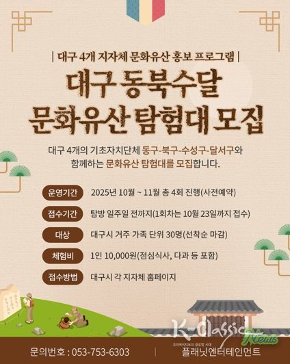 K-Classic News 기자 | 대구 수성구, 동구, 북구, 달서구가 협력해 지역의 역사와 문화를 함께 배우고 체험하는 ‘대구 문화유산 탐험대’ 운영을 시작한다.