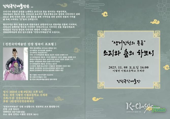 K-Classic News 기자 | (재)생거진천문화재단은 오는 11월 8일 오후 4시 이월초등학교 ‘무제관’에서 진천국악예술단이 ‘진천의 풍류, 소리와 춤의 하모니’ 공연을 개최한다고 20일 밝혔다.