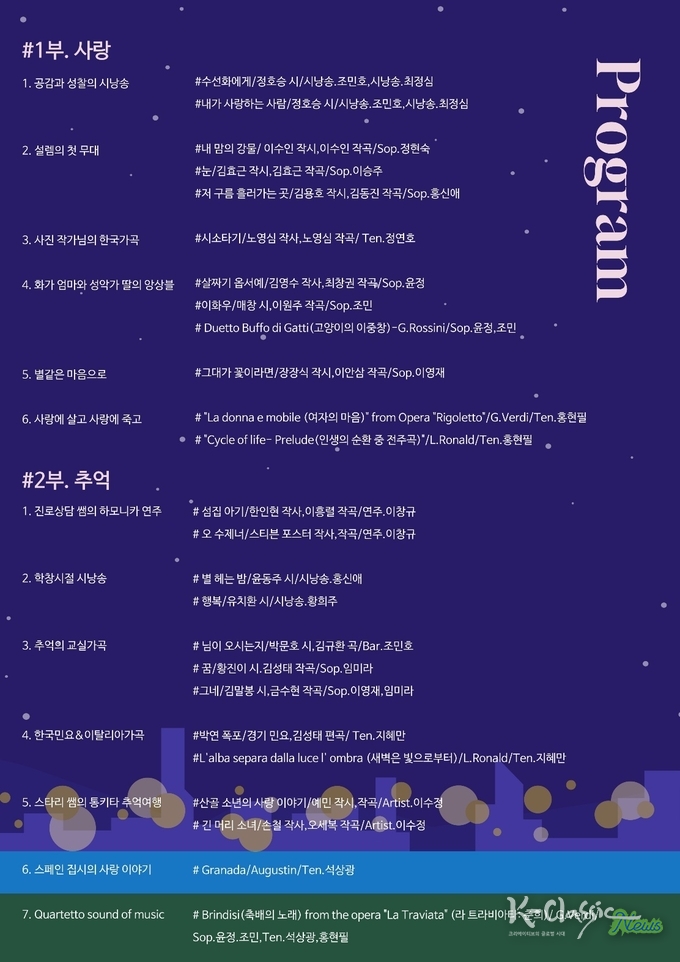 프로그램은 소프라노 이영재의 ‘그대가 꽃이라면’, 테너 지혜만의 ‘박연폭포’, 하모니카 이창규의 ‘섬집아기’, 오페라 아리아와 클래식·가요곡 등이 이어지며 장르의 경계를 넘나드는 다채로운 구성을 선보인다.