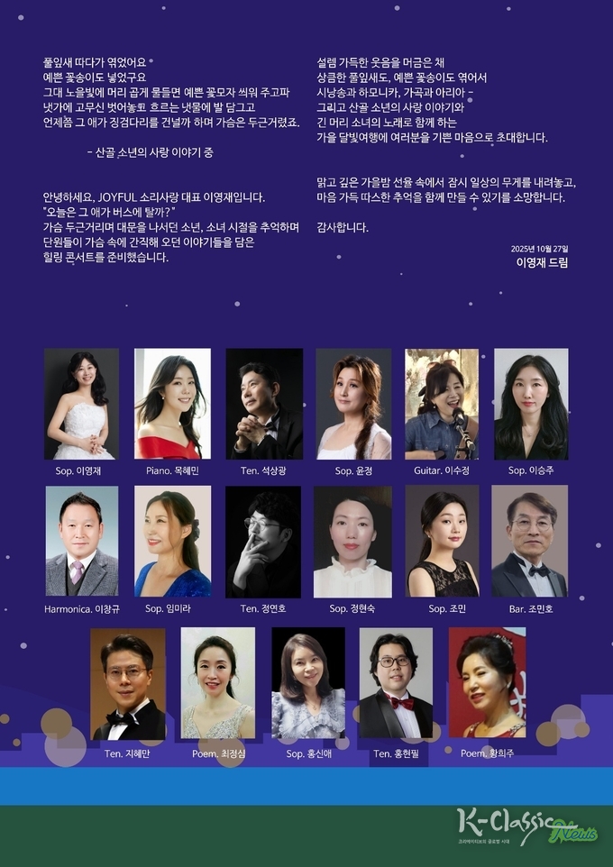 한편 Joyful소리사랑은 이번 공연을 통해 ‘10대 시절의 동심으로 돌아가고 싶다’는 마음을 담았다고 밝혔다. 이영재 대표는 “어린 시절 동네 마당에서 함께 놀던 친구들과 노래하고 이야기하던 그 시절의 순수함을 다시 느껴보고 싶었다”며 “보름달이 뜨는 가을밤, 음악과 함께 마음의 여행을 떠나는 시간이 되길 바란다”고 전했다.