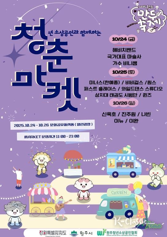 K-Classic News 기자 | 원주시는 원주만두축제 기간인 오는 24일부터 26일까지 중앙동 문화공유플랫폼에서 2025 강원 소상공인 상생 직거래장터 ‘만두축제와 함께하는 청춘마켓’을 운영한다.