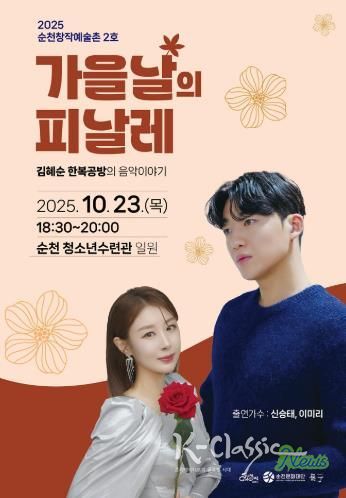 K-Classic News 기자 | 순천문화재단이 운영 중인 순천창작예술촌 2호 ‘김혜순 한복공방’에서는 오는 23일 오후 7시, 가을 감성을 담은 음악 공연 「가을날의 피날레」(부제: 김혜순 한복공방의 음악 이야기)를 순천시 청소년 수련관 야외무대(순천시 금곡길 20)에서 개최한다고 밝혔다.
