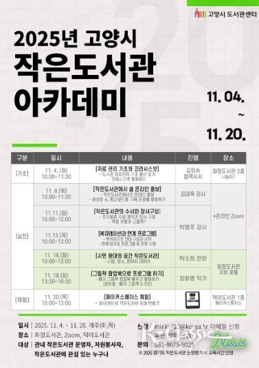 K-Classic News 기자 | 고양특례시는 관내 공·사립 작은도서관 운영자와 자원봉사자의 역량 강화를 위해 오는 11월 4일부터 20일까지 총 7회에 걸쳐‘2025년 작은도서관 아카데미’를 운영한다고 밝혔다.