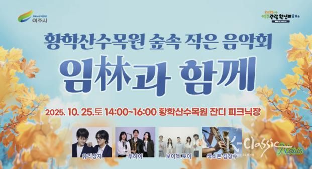 K-Classic News 기자 | 여주시는 오는 10월 25일 오후 2시부터 4시까지 황학산수목원 잔디피크닉장에서 ‘임(林)과 함께’ 음악회를 연다고 밝혔다.