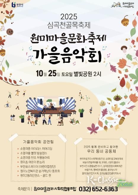 K-Classic News 기자 | 부천시는 10월 25일 원미별마루와 별빛공원 일대(부천로 90번길 51)에서 ‘2025년 심곡천 골목축제–원미마을문화축제 가을 음악회’를 연다. 이번 행사는 부천시 원도심재생과가 주최하고, 원미마을관리사회적협동조합이 주관한다.