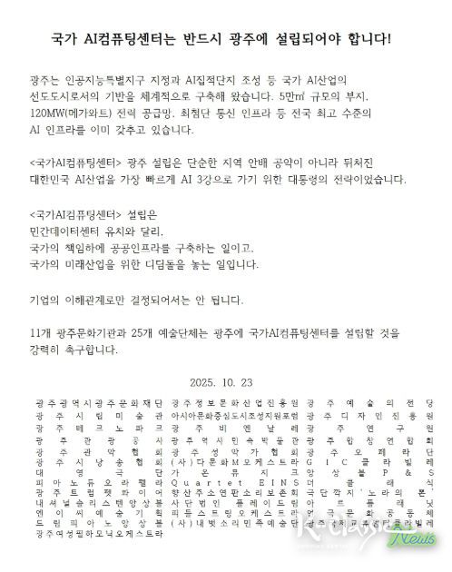 광주문화예술계는 “AI산업의 균형발전과 국가경쟁력 강화를 위해 광주에 국가AI컴퓨팅센터가 설립되어야 한다”며 “문화예술과 기술이 공존하는 창의도시 광주에서 대한민국 AI산업의 새로운 도약이 시작되길 바란다”고 덧붙였다.